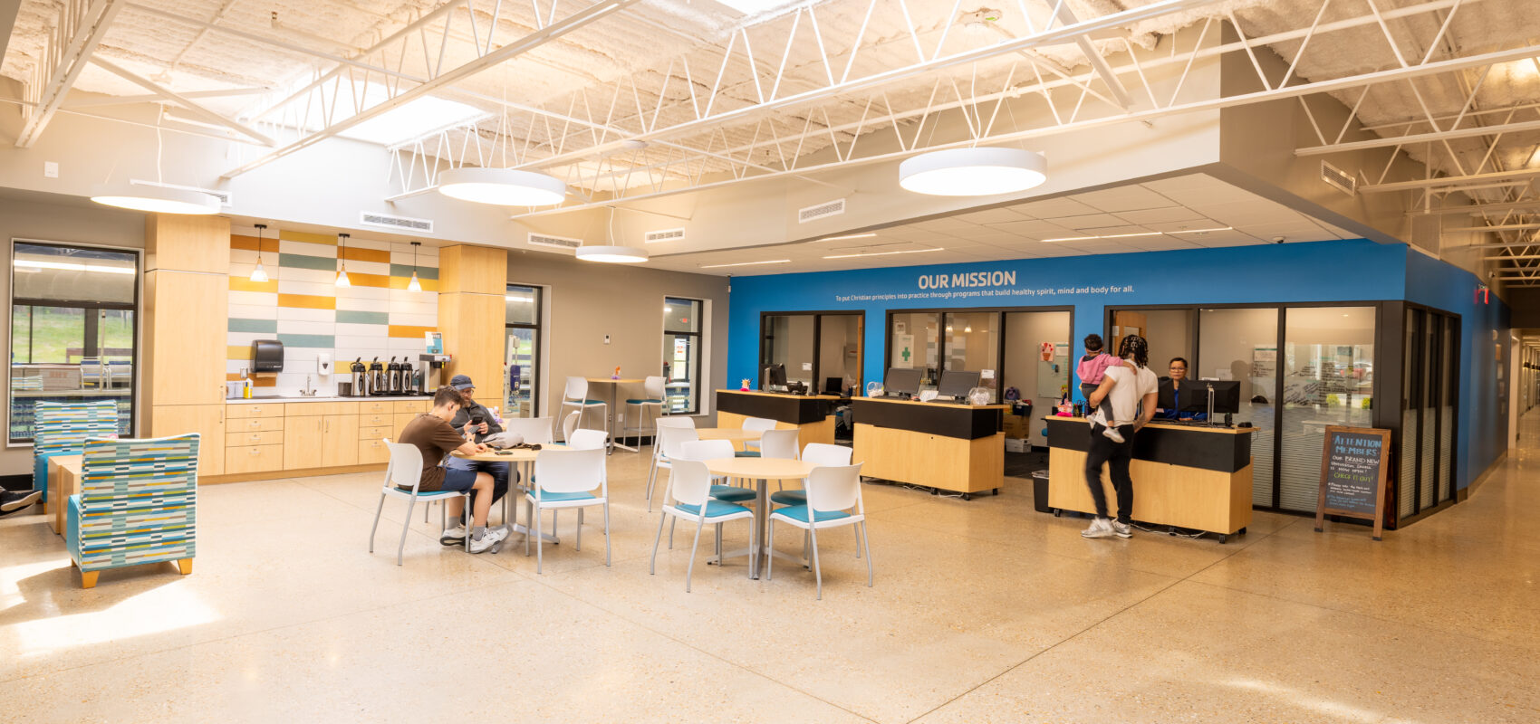 Renovations focused on reimagining the front of the facility as a central hub for members and the community. Highlights include a new Family Locker Room with direct access to the Natatorium, an expanded entrance lobby with membership services, staff offices, and a Café space, enhanced Childwatch facilities, a new intergenerational meeting room, and a larger multipurpose community room with kitchenette, storage, and audio-visual amenities.
